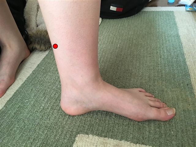 場所は足の内側(親指側)のくるぶしのすぐ上に指4本を沿えてスネの骨のすぐ後ろに位置するところ。